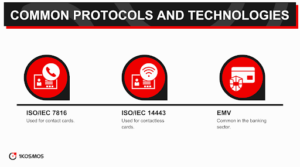 These protocols and technologies govern the physical characteristics, radio frequencies, and data transmission between the intelligent card reader and the reader.