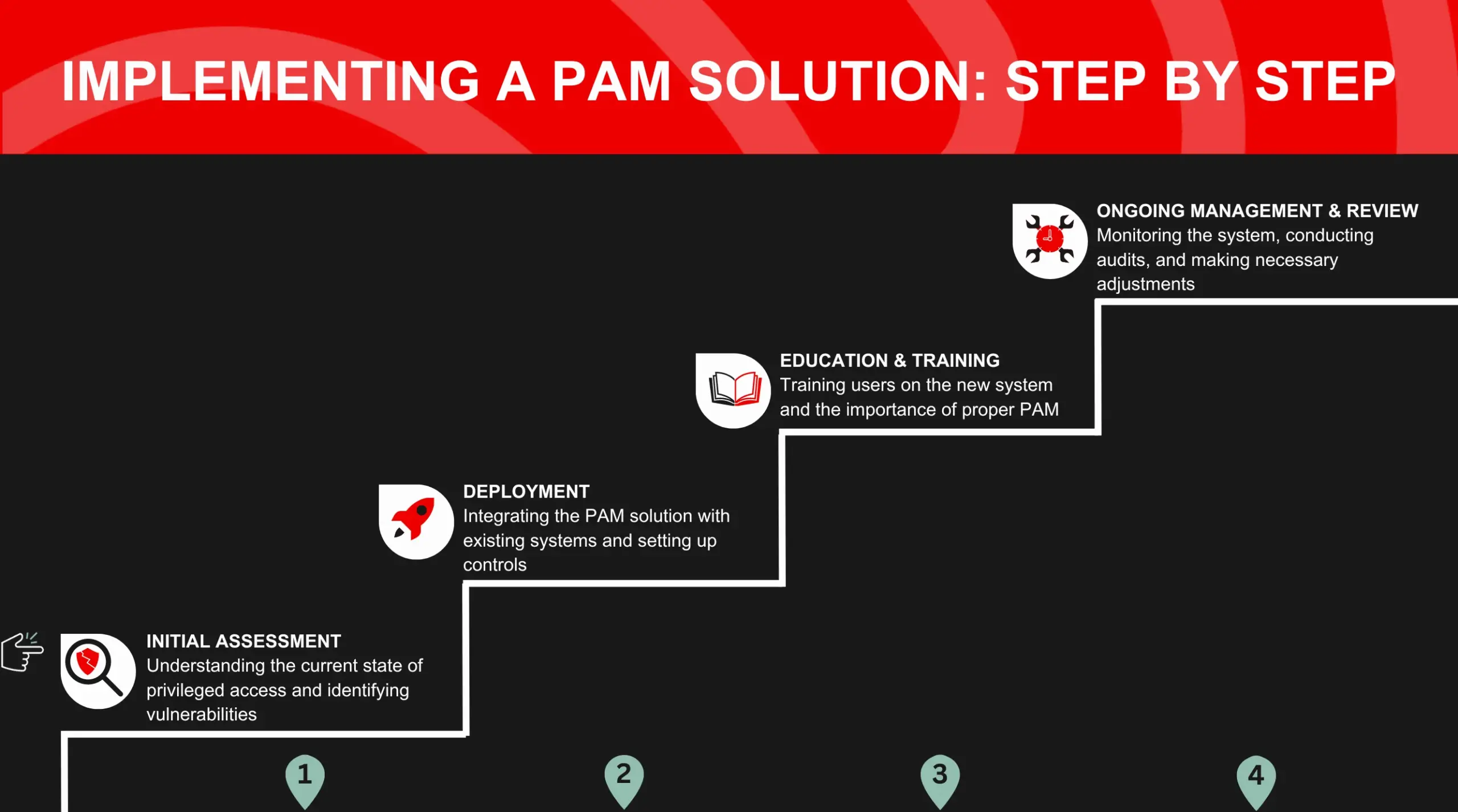 The first step in introducing a PAM solution is to evaluate the organization’s present privileged access situation. The PAM strategy may then be built around the findings of this evaluation, which pinpoints any weak spots. The next step is deployment, which entails connecting the PAM solution to the rest of the infrastructure and establishing the required safeguards.