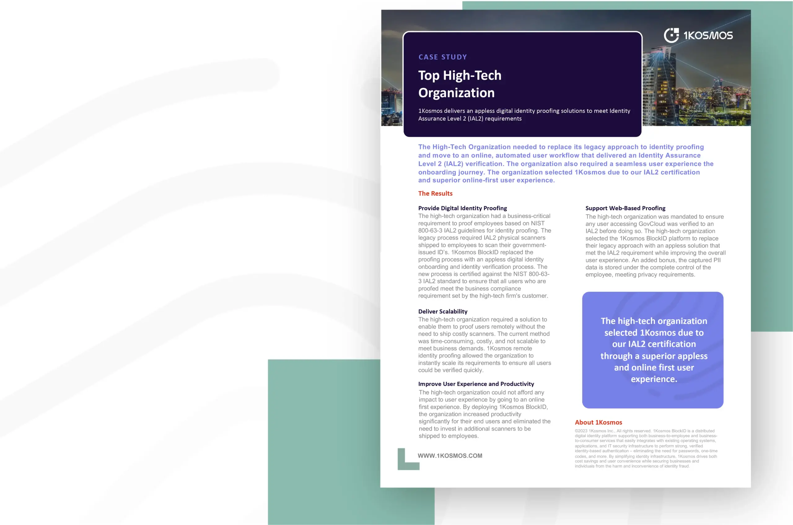 The high-tech organization was mandated to ensure any user accessing GovCloud was verified to an IAL2 level before doing so. The high-tech organization selected the 1Kosmos platform to replace their legacy approach with an appless solution that met the IAL2 requirement while improving the overall user experience. An added bonus, the captured PII data is stored under the complete control of the employee, meeting privacy requirements.