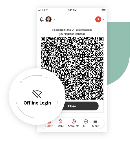 For accounts that are set for offline access, the fully brandable 1Kosmos app generates a QR code that a user would scan with their webcam. To work, both the laptop and mobile device need to be offline. The connection and decryption process for offline access is fast, secure, and seamless for the user.
