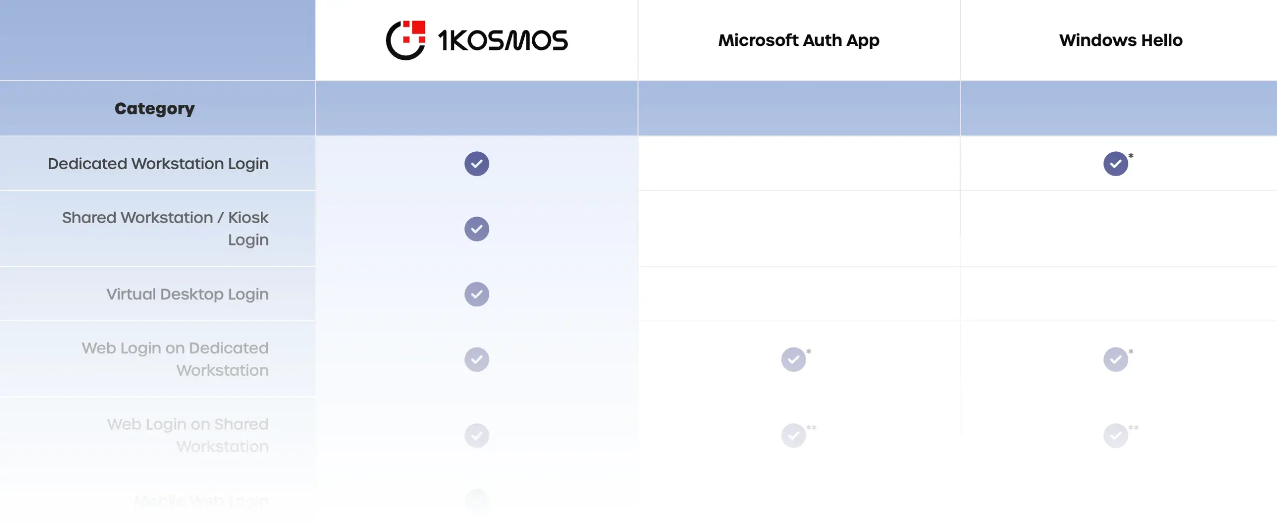 Microsoft Authentication with 1Kosmos Feature Comparison